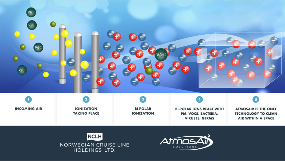חברת נורוויג’ן קרוז ליין אחזקות בע”מ (NCLH) מתקינה מערכות טיהור אוויר חדשניות של חברת אטמוס-אייר (AtmosAir) לנטרול נגיף הקורונה. מערכות מטהרי האוויר יותקנו בכל צי 28 הספינות של החברה, בשלושת החברות הבנות: נורוויג’ן קרוז ליין (Norwegian Cruise Line), אושיאנייה קרוזס (Oceania Cruises) וריג’נט סבן סיז (Regent Seven Seas Cruiseis).