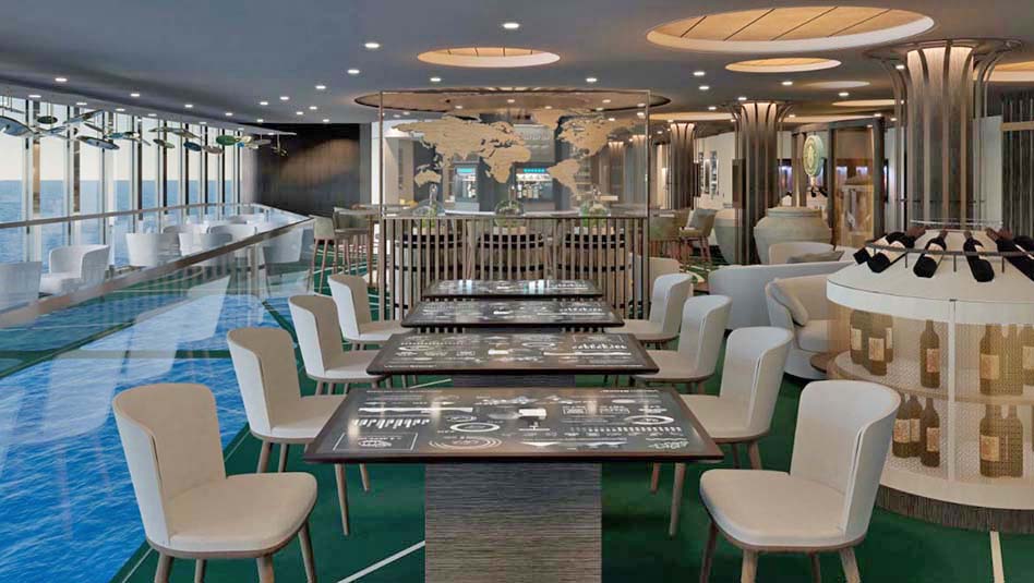 הספינה תציע גם 21 ברים וטרקלינים, כולל 5 ברים חיצוניים ו-16 מקורים, החל מ-Champagne Bar המעודן ועד לטרקלין Sky המיועד למבוגרים בלבד, שבו קוקטיילים מולקולריים מתענגים על נוף פנורמי.
